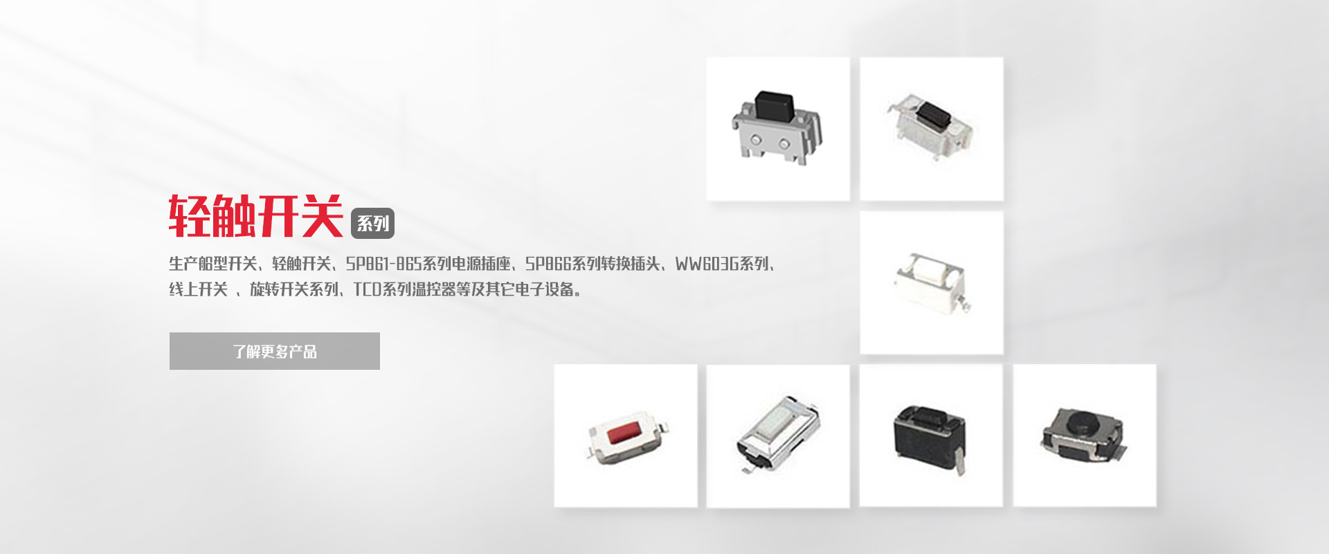 公司專業(yè)生產(chǎn)船型開(kāi)關(guān)、輕觸開(kāi)關(guān)、SP861-865系列電源插座、SP866系列轉(zhuǎn)換插頭、WW11系列微動(dòng)開(kāi)關(guān)、WW01-03、09系列按鈕開(kāi)關(guān)DS、WW系列指示燈開(kāi)關(guān)、WW603G系列 線上開(kāi)關(guān) 、旋轉(zhuǎn)開(kāi)關(guān)系列、TCD系列溫控器等及其它電子設(shè)備。